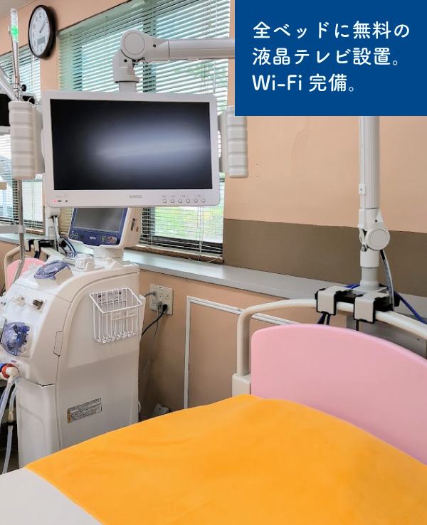当院では「居心地の良い透析室」をコンセプトに、入院透析・外来通院透析・旅行透析・終末期透析に至るまで、すべての透析患者さんに寄り添い、お一人おひとりに合わせた個別対応を大切にしております。